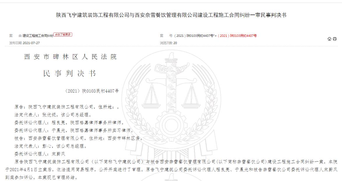 根據(jù)陜西飛寧建筑裝飾工程有限公司與西安奈雪餐飲管理有限公司建...
